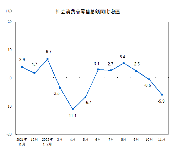 國家統計局:11月份社會消費品零售總額下降5.9%