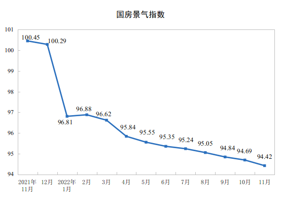11月份,房地產開發景氣指數(簡稱“國房景氣指數”)為94.42。