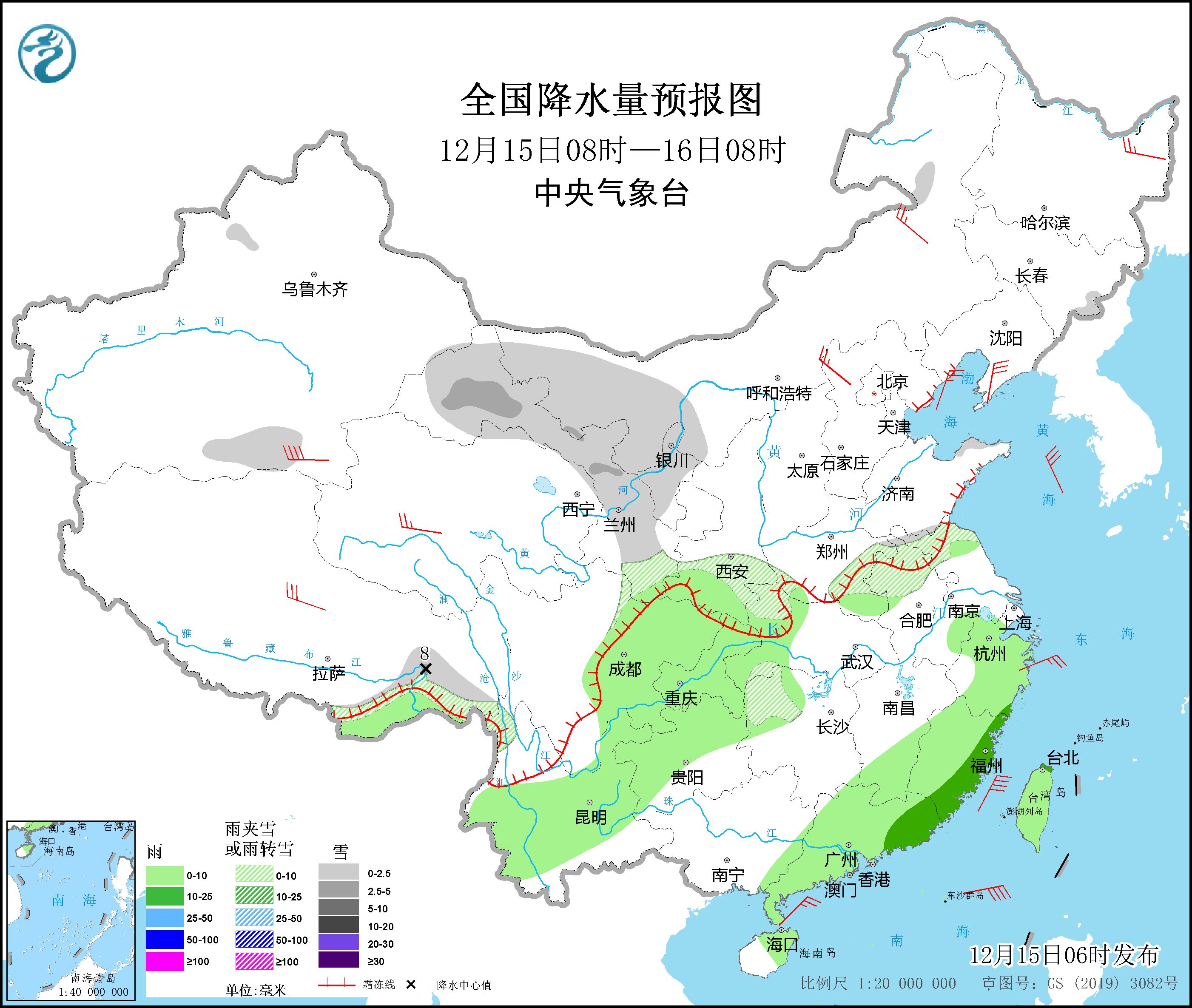 *12月15日08時至16日08時,*新疆南疆盆地南部、內蒙古西部、西藏東南部、西北地區中部和東北部等地的部分地區有小到中雪,局地有大雪(5~8毫米)。西北地區東南部、西南地區東部和南部、江南中東部和南部、華南東部、台灣島等地的部分地區有小雨,其中,福建東部、廣東東部等地的部分地區有中雨。新疆南疆盆地、西藏北部、青海南部、內蒙古東北部、黑龍江東北部、遼東半島、河北北部等地的部分地區有4~6級風,其中,新疆南疆盆地等地的部分地區有6~7級風(見圖2)。