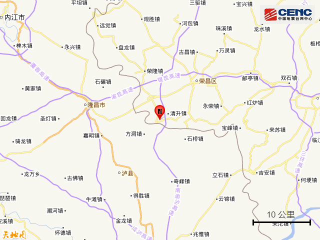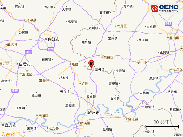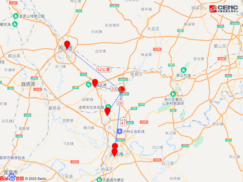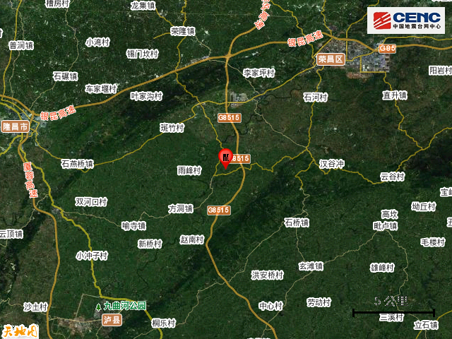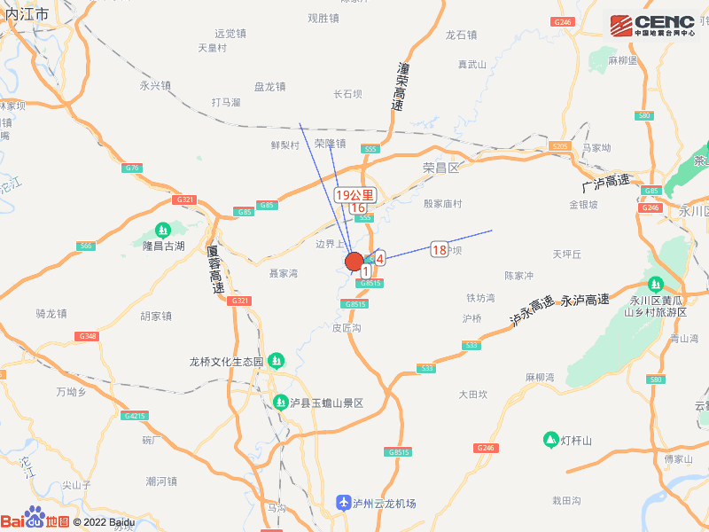 周邊縣城: 震中距四川瀘縣20公里、距四川隆昌市20公里、距四川??龍馬潭區43公里、距四川??江陽區47公里、距四川??東興區52公里,距榮昌區18公里,距重慶市107公里。