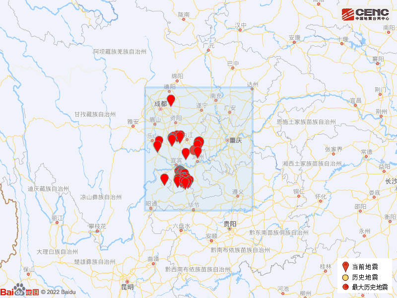 歷史地震: 根據中國地震台網速報目錄,震中周邊200公里內近5年來發生3級以上地震共256次,最大地震分別是2021年9月16日在四川瀘州市瀘縣發生的6.0級地震(距離本次震中18公里)和2019年6月17日在四川宜賓市長寧縣發生的6.0級地震(距離本次震中121公里),按震級大小前50次歷史地震分佈如圖。