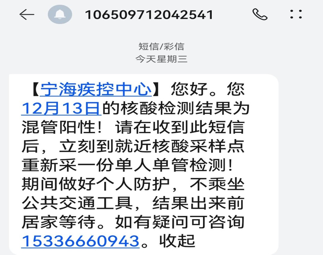14日,寧海 發佈最新提醒真假混管陽性短信通知