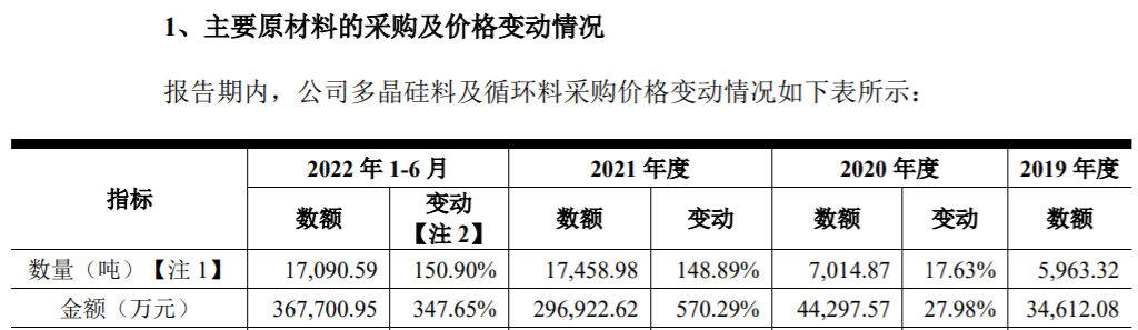 再來看美科股份的生產信息,美科股份的核心產品單晶硅片的上游環節為單晶圓棒,公司所需單晶圓棒大部分為自產,也即採購來多晶硅料和循環料後,藉助於單晶爐製造單晶圓棒。根據招股書披露,美科股份的自產單晶圓棒2021年產量為2.43萬噸,相當於2020年0.77萬噸的三倍以上;但與此同時,2021年採購的多晶硅料和循環料數量卻為17458.98噸,僅相當於2020年採購量7014.87噸的2.5倍以下,顯著低於同期單晶圓棒產量的增幅。
