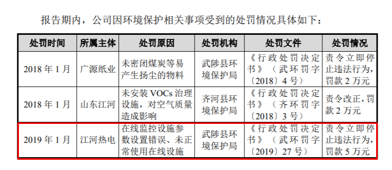 江河熱電是江河紙業全資子公司,招股書稱該公司無實際經營業務。但又披露,2021年前三季度,江河熱電營收1063.2萬元,淨利潤374.5萬元。同時披露2019年1月,江河熱電因在線監控設施參數設置錯誤,未正常使用在線設施被所在地武陟縣環境保護局罰款5萬元。子公司江河熱電究竟有無實際經營,招股書信息披露自相矛盾。