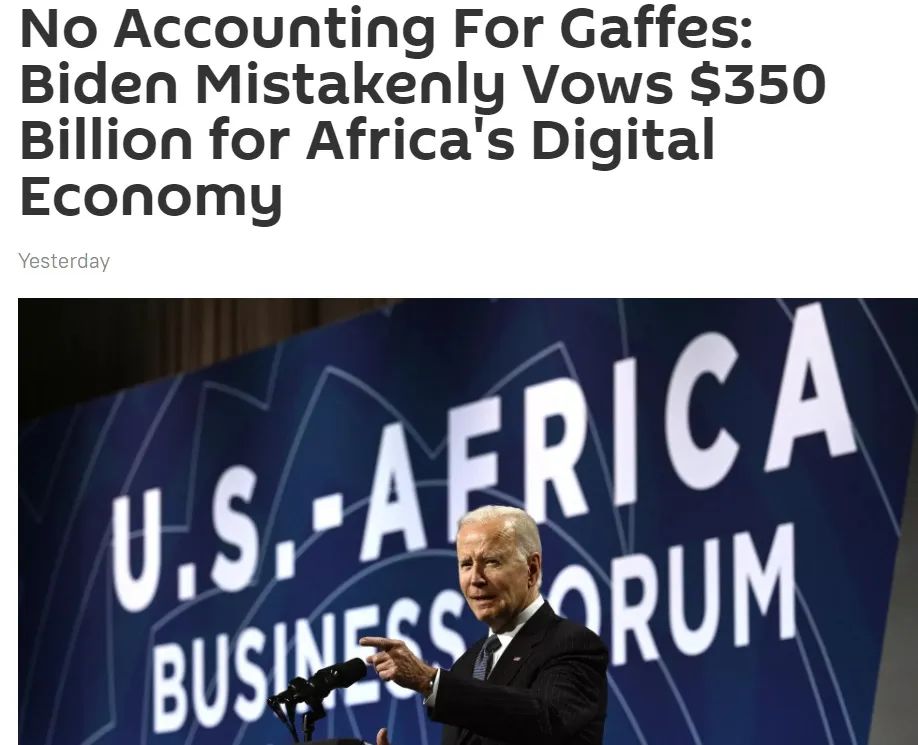 就在本次美非峯會演講期間,拜登出現口誤,將支持非洲數字化轉型的投資金額3.5億美元,説成了3500億美元。