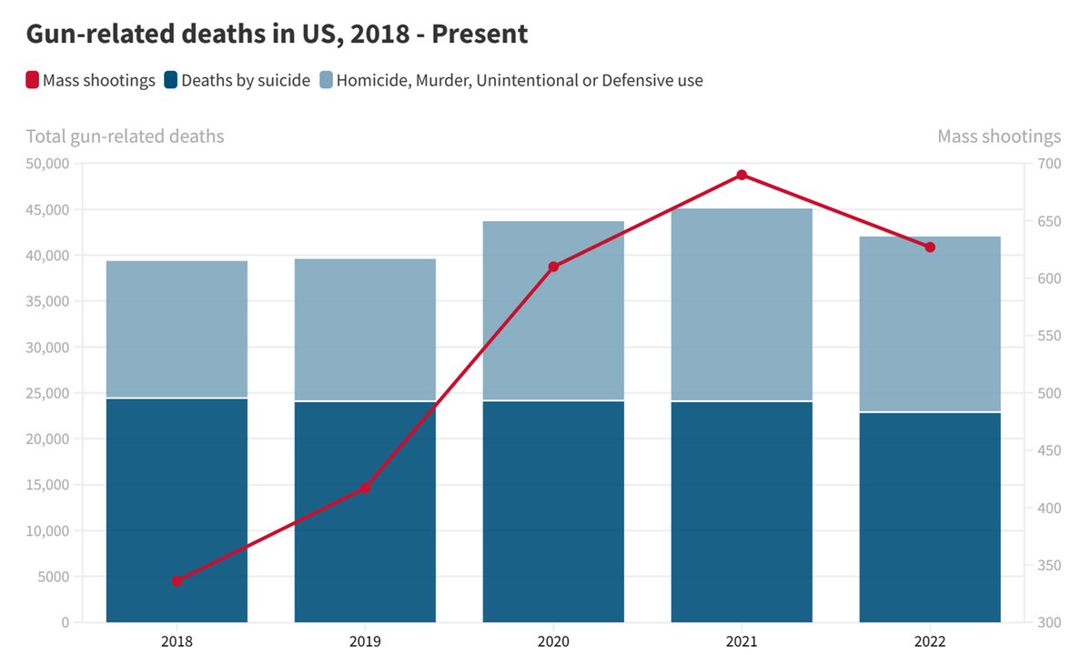 頻繁發生的大規模槍擊事件幾乎遍及美國人生活的方方面面:2015年南卡羅來納州查爾斯頓一座黑人教堂發生槍擊,2016年佛羅里達州奧蘭多一家夜店發生槍擊,2017年佛羅里達州帕克蘭市一所中學發生槍擊,2018年賓夕法尼亞州匹茲堡一所猶太教堂發生槍擊,2019年得克薩斯州埃爾帕索市一家沃爾瑪超市發生槍擊,2022年得克薩斯州尤瓦爾迪市羅布小學發生槍擊……