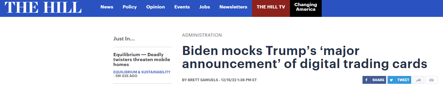 美媒:特朗普公佈其“重大消息”,系宣傳NFT數字藏品,被拜登諷刺了