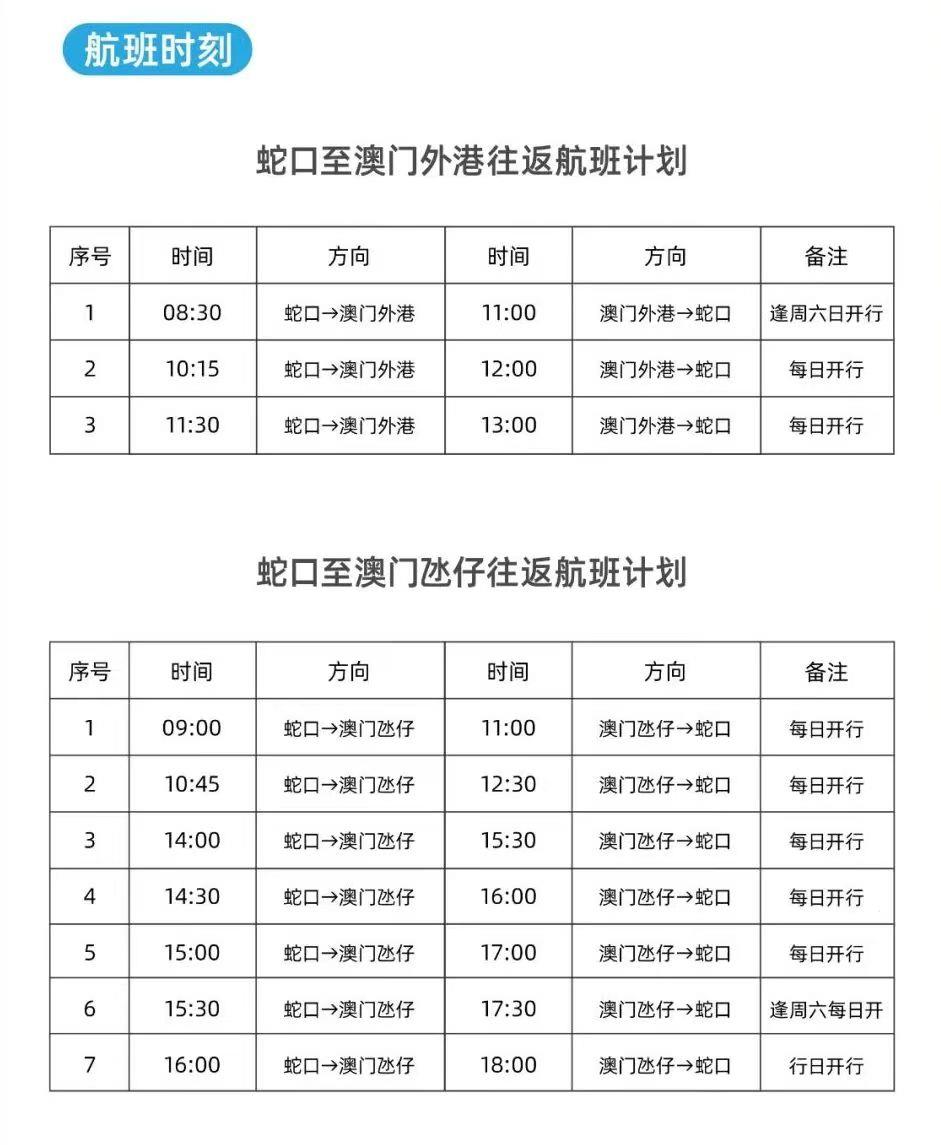 本次調整僅針對週六日航班,平日往返班次保持不變。調整後,週六日往返兩地航班將總計開行10個往返20班次。其中,由深圳蛇口至澳門外港的往返航班由4班調整為6班,服務時間調整為早8:30至下午13:00;由深圳蛇口至澳門氹仔的往返航班由6班調整為8班,服務時間調整為早9:00至下午18:00。