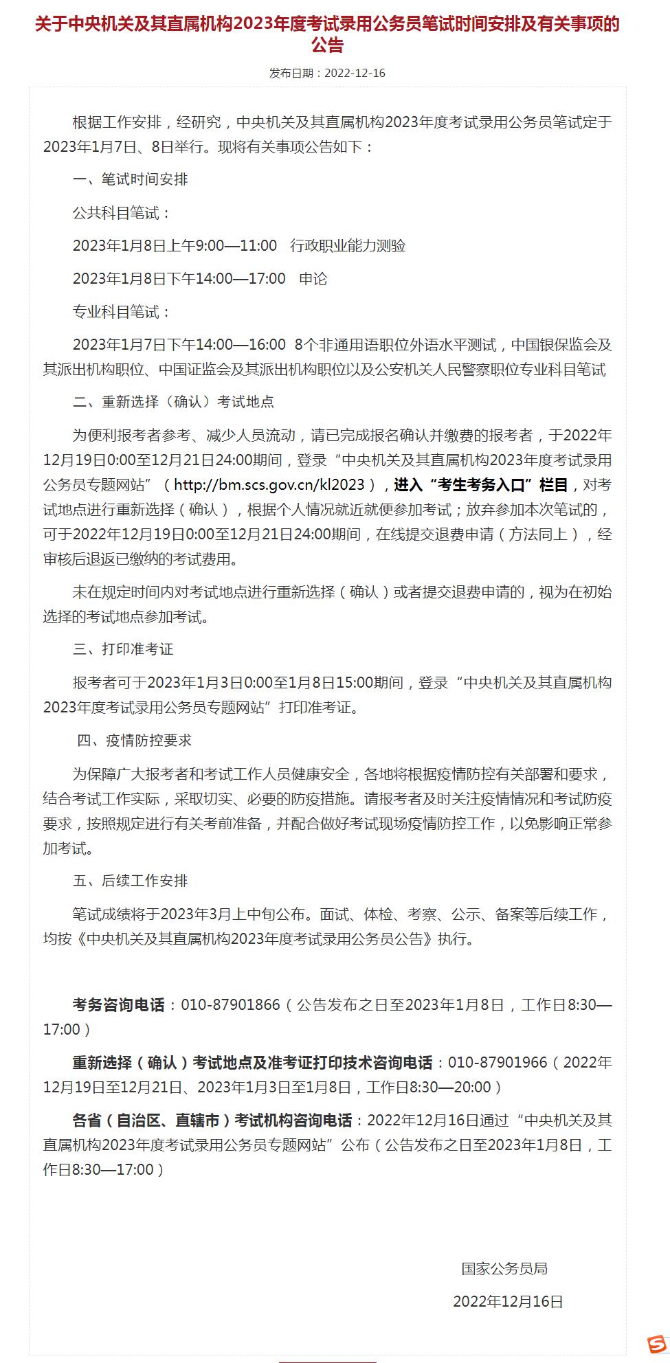 根據工作安排,經研究,中央機關及其直屬機構2023年度考試錄用公務員筆試定於2023年1月7日、8日舉行。現將有關事項公告如下: