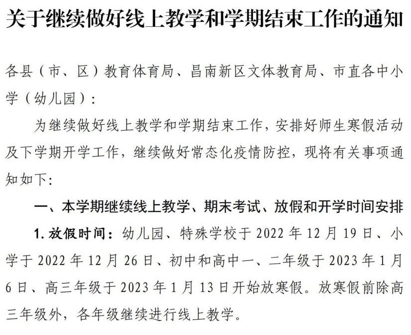 記者獲悉,12月13日,吉安市教育體育局發佈《關於做好2023年中小學幼兒園寒假工作的通知》明確,今年全市各中小學幼兒園實行錯時放寒假,幼兒園、小學定於2022年12月19日放寒假,初中及高一、高二年級定於2022年12月26日放寒假,高三年級定於2023年1月15日放寒假。