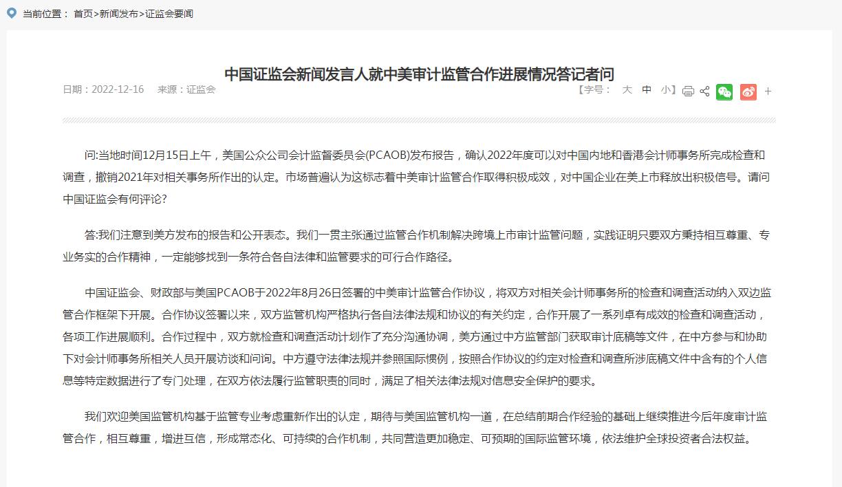 問:當地時間12月15日上午,美國公眾公司會計監督委員會(PCAOB)發佈報告,確認2022年度可以對中國內地和香港會計師事務所完成檢查和調查,撤銷2021年對相關事務所作出的認定。市場普遍認為這標誌着中美審計監管合作取得積極成效,對中國企業在美上市釋放出積極信號。請問中國證監會有何評論?