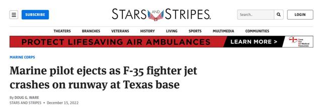 《星條旗報》稱,製造這款先進戰機的洛克希德·馬丁公司證實了這起事故,並表示事故發生在沃思堡海軍航空站聯合儲備基地的一條“共用跑道”上。