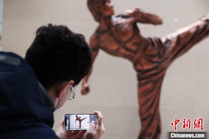 12月15日,一位台青在湖北美術館內拍攝《李小龍》雕像。 董曉斌 攝