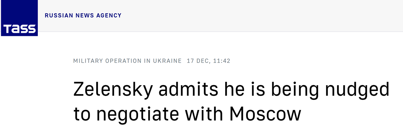 塔斯社還提到,美國政治新聞網11月援引消息稱,“由於拜登政府的軟磨硬泡”,澤連斯基不得不收回他之前有關“不可能與俄政府談判”的説法,並在當月列出的與莫斯科談判的五個先決條件時,沒有提到不可能與普京會談。政治新聞網還稱,烏克蘭政府立場的改變是在基輔和華盛頓之間進行了長時間會談之後發生的,也包括在白宮國家安全顧問傑克·沙利文訪問基輔期間。