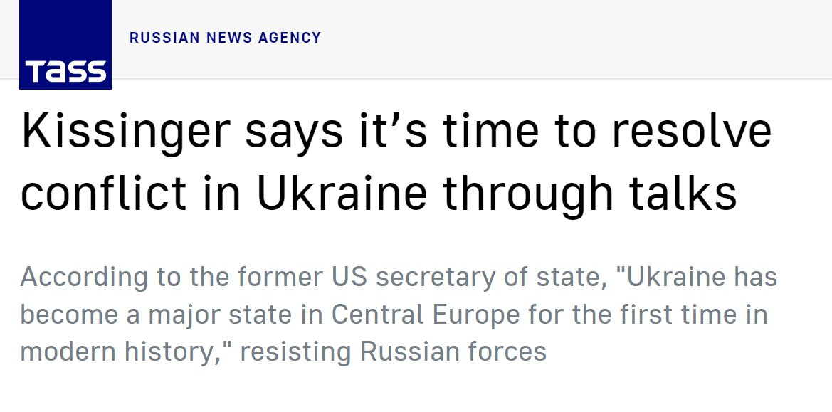 塔斯社還注意到,根據基辛格的説法,“烏克蘭在現代歷史上第一次成為中歐的一個主要國家”抵抗俄軍。基辛格表示,他認為烏克蘭的中立已經沒有意義,“和平進程應該包含建立烏克蘭與北約的聯繫,無論表達的方式如何。”