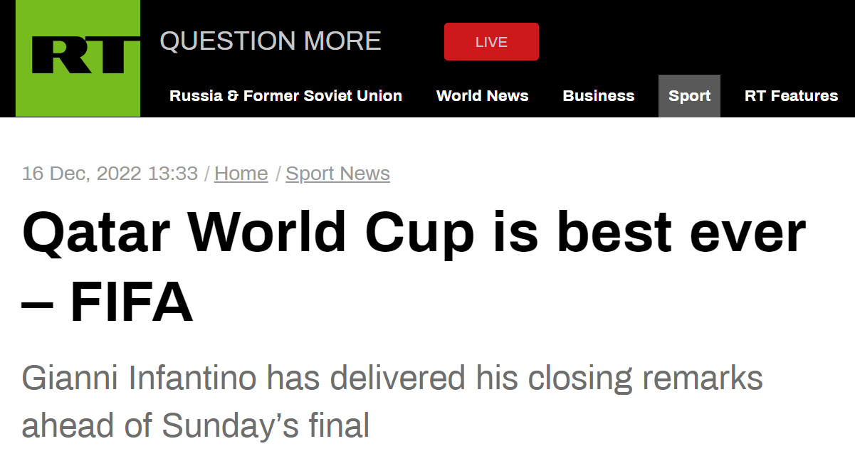 RT補充稱,因凡蒂諾在會後舉行的新聞發佈會上説:“國際足聯理事會一致讚揚了本屆世界盃,它展示出了獨特的凝聚力,感謝所有參與其中的人——當然包括卡塔爾,所有為我們工作的志願者,以及所有那些為使得本屆世界盃成為有史以來最好的世界盃而做出貢獻的人。”