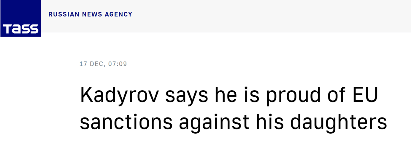 卡德羅夫在其即時通訊軟件Telegram上寫道,“你們都是我柔弱年幼的女兒,但整個西方世界都害怕你們。我為你們感到無比自豪,我的寶貝們。歡迎加入歐盟制裁黑名單。”他還補充説,西方的制裁已成為將他本就很親密的家庭團結起來的另一個因素。
