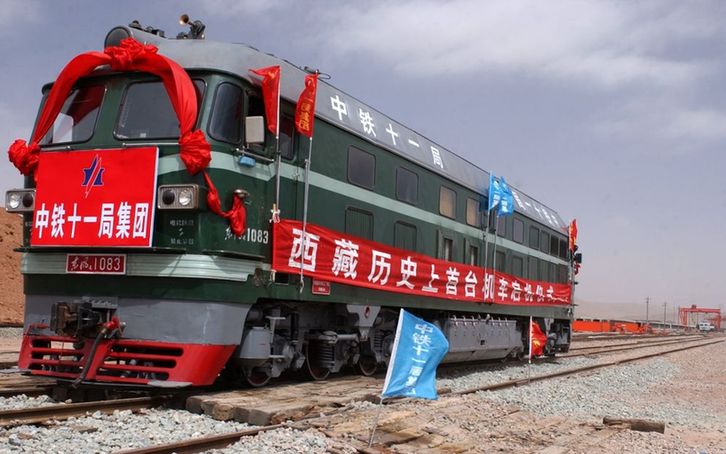 ↑ 2004年3月23日,在海拔4704米的青藏鐵路海拔最高鋪架基地——西藏安多鋪架基地上,中鐵十一局1083號東風4型內燃機車向雪域高原緩緩駛來。這標誌着西藏曆史上出現了第一台鐵路機車。
