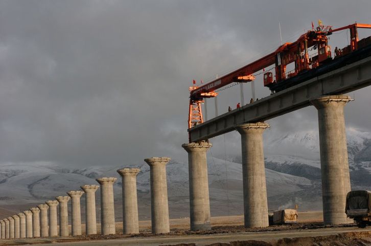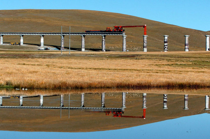 ↑ 2004年10月1日,工人們正在架設青藏鐵路那曲以橋代路特大橋。