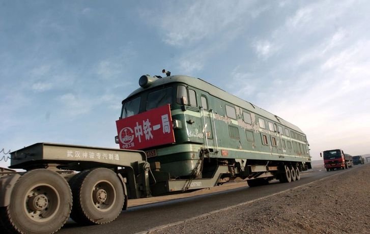 ↑ 2005年4月19日,一輛汽車上裝着一輛機車,從青海省格爾木市秀水河車站經過青藏公路向西藏安多方向行駛。青藏鐵路建設總指揮部從2004年3月開始陸續把近200台機車、鋪軌機、架橋機、軌道車等大型鋪架設備用汽車從格爾木安全運抵西藏安多,途中翻越海拔5231米的唐古拉山埡口,創造了鐵路建設史上的奇蹟。