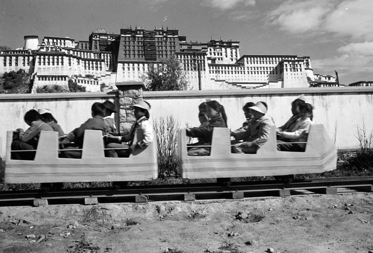 ↑ 1987年10月1日,在拉薩勞動人民文化宮內新建成一座大型遊樂場裏,小朋友們在乘坐電動小火車。