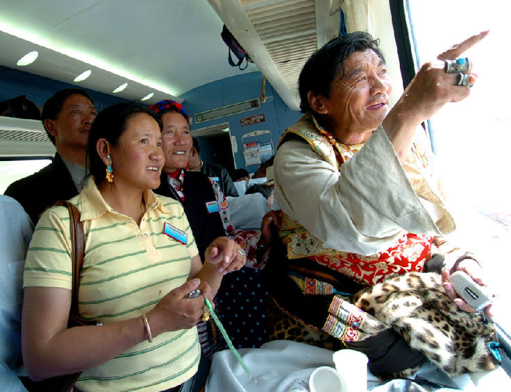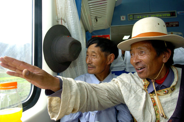 ↑ 2006年7月1日,烏金(右一)在“藏2”次列車經過自己家鄉安多時,興奮地指向車外,向同伴介紹。