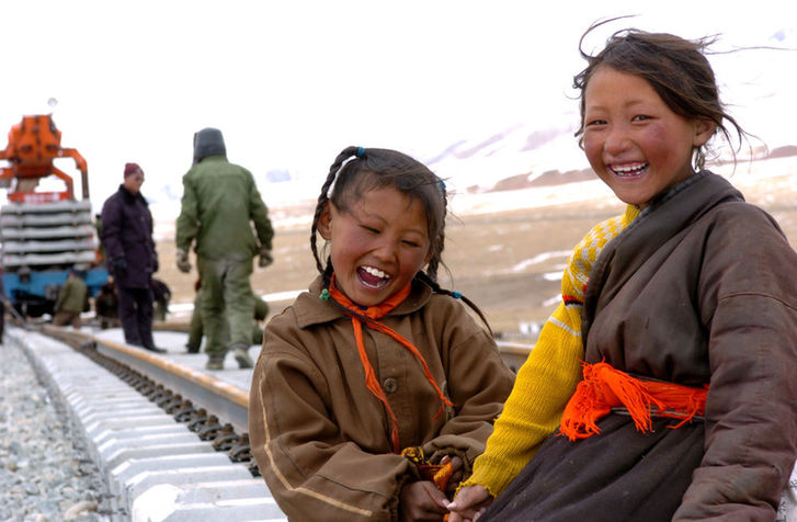 ↑ 2005年3月30日,兩名藏族孩子在家附近的青藏鐵路建設工地玩耍。