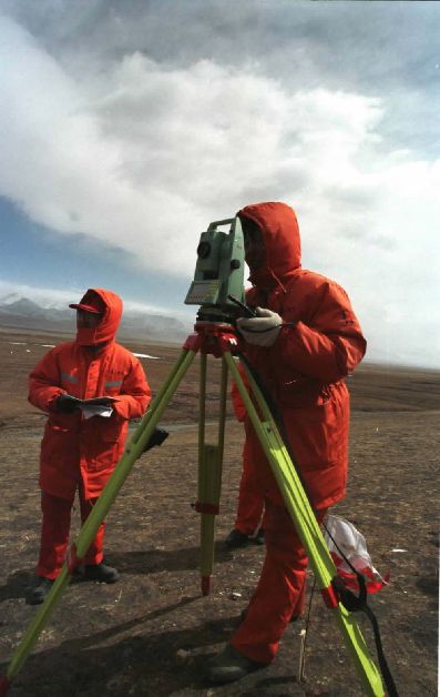 ↑ 2001年4月,鐵道部第一設計院的勘測人員在海拔近5000米的四道梁加緊進行青藏鐵路的勘測工作。在國務院批准修建青藏鐵路後,鐵道部第一設計院的上千名勘測人員克服惡劣的自然條件,為青藏鐵路早日開工夜以繼日地工作。