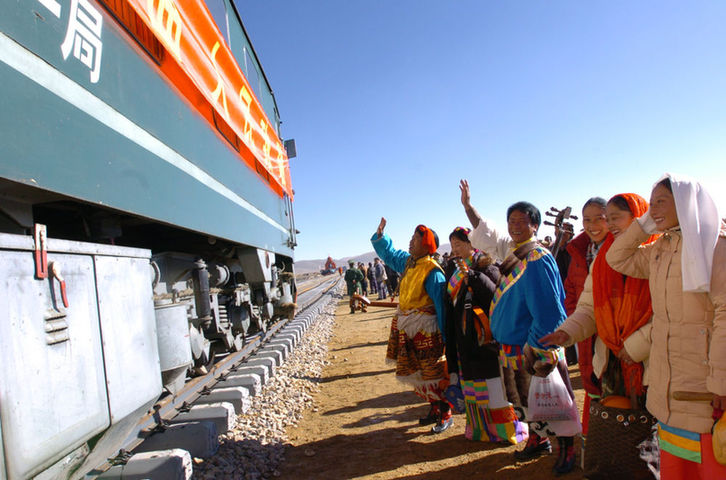 ↑ 2004年10月10日,藏北羣眾迎接火車抵達那曲。10月9日,青藏鐵路安多到那曲138公里的鋪軌完成。10月10日,從安多出發的西藏境內第一列火車上午10點抵達藏北重鎮——那曲鎮。