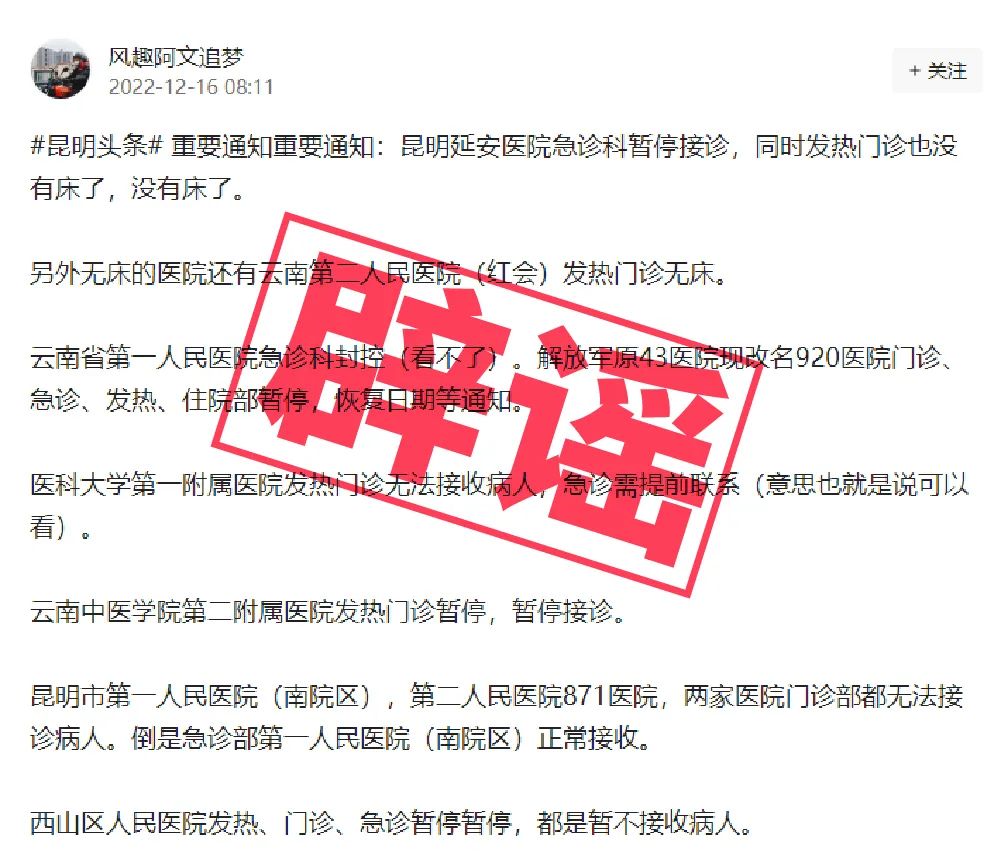 昆明部分醫院急診科停診、發熱門診無牀?官方闢謠:不實!全部正常接診!