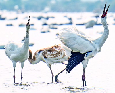 白鶴在南昌五星白鶴保護小區嬉戲。光明圖片