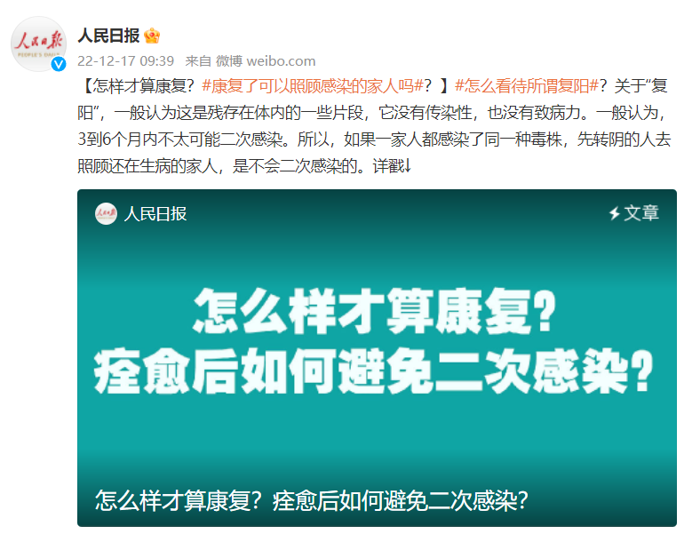 答:這三年來我們確實發現有一部分人在解除隔離之後核酸又復陽了,或者抗原轉陰之後又復陽了,一般認為這是殘存在體內的一些片段,它沒有傳染性,也沒有致病力,從三年的觀察來看,解除隔離後,沒有發現復陽的人傳染給他們周圍的人,也沒有發現症狀反覆。