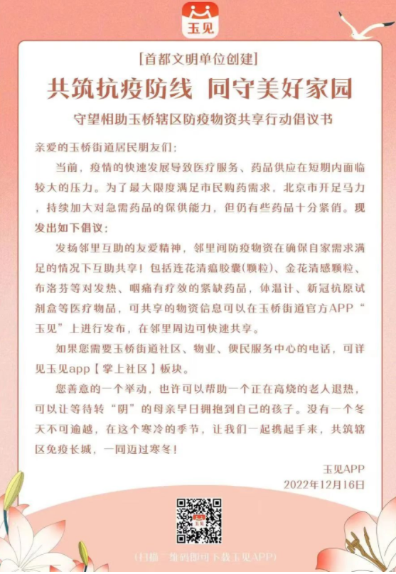 北京通州多個街道發倡議:鄰里互幫互助,共享防疫物資