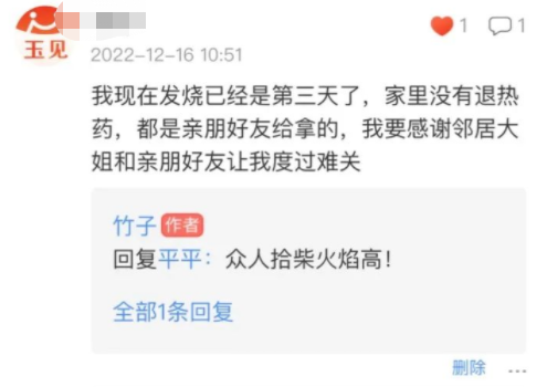 12月16日,家住喬莊北街小區的居民梁建平在玉橋街道“玉見”APP上寫道,“發燒已經是第三天了,家裏沒有退熱藥,都是親朋好友給拿的,我要感謝鄰居大姐和親朋好友讓我渡過難關。”