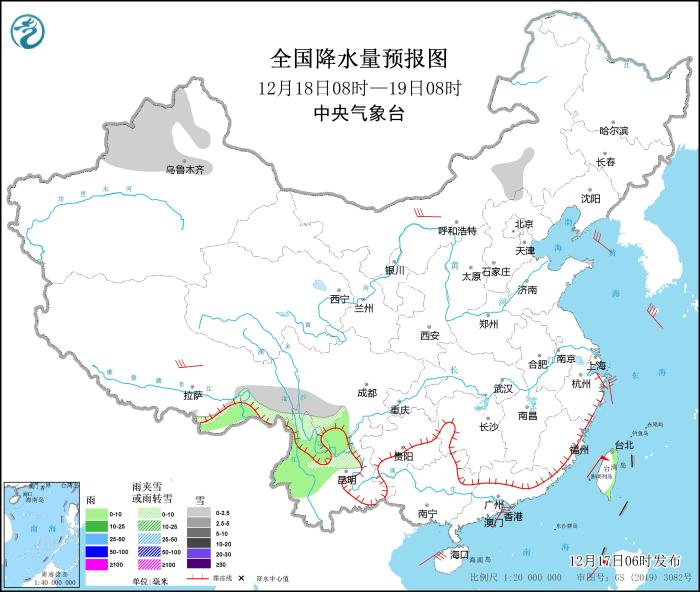 12月18日08時至19日08時,新疆北疆北部和伊犁河谷、內蒙古中東部、山東半島北部、西藏東部、川西高原南部、雲南東北部、貴州西部等地部分地區有小雪或雨夾雪。西藏東南部、雲南西部、四川盆地南部、台灣島東部等地部分地區有小雨。內蒙古中東部、西藏中北部等地部分地區有4~6級風。東海中南部海域、台灣海峽、南海北部和中部海域、北部灣將有7~9級風、陣風10級左右。