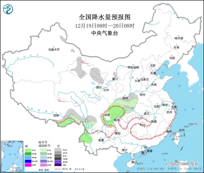 12月19日08時至20日08時,甘肅中北部、西藏東南部、四川東北部、陝西南部、湖北西部等地部分地區有小雪或雨夾雪。西藏南部、雲南西部、四川盆地東部等地部分地區有小雨。內蒙古中西部、西藏中北部等地部分地區有5~6級風,東海南部、台灣海峽、巴士海峽、南海海域將有7~9級風、陣風10級左右。