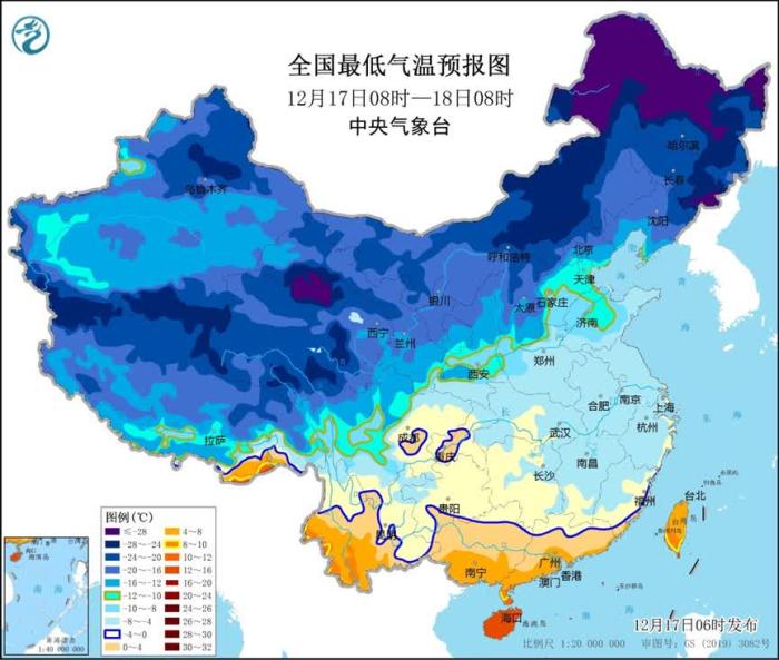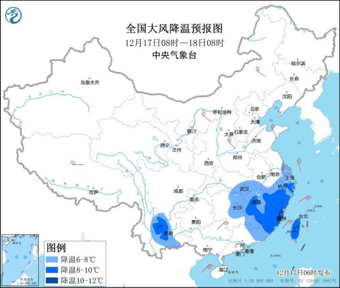 中央氣象台12月17日06時繼續發佈寒潮藍色預警:受強冷空氣影響,預計,12月17日08時至12月18日08時,江南中東部、華南中東部以及雲南中部等地的部分地區將先後降温6~8℃,其中,雲南北部、福建東部等地部分地區降温10-12℃。12月18日早上最低温度0℃線將位於廣西北部、廣東中北部至福建南部一帶。華北、黃淮及以南地區等地先後有4~6級偏北風,陣風7-9級;我國東部海域和南部海域等地部分地區有8~9級風,陣風可達10-11級。