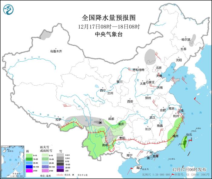 12月17日08時至18日08時,內蒙古中東部、山東半島、西藏東南部,川西高原南部、雲南北部、貴州西部等地的部分地區有小到中雪或雨夾雪,其中,川西高原南部局地有大雪到暴雪。雲南中南部、四川盆地東南部、福建中東部、浙江東部、台灣島等地的部分地區有小到中雨。內蒙古中東部、華北大部、山東半島、江南東部、兩廣等地的部分地區有4~6級風,陣風7-9級。黃海南部海域、東海大部海域、台灣海峽、台灣以東洋麪、南海北部海域、北部灣將有8~9級、陣風10~11級的偏北到東北風。