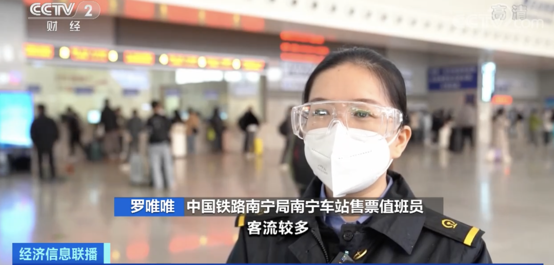 中國鐵路南寧局南寧車站售票值班員 羅唯唯*:*根據售票情況來看,南寧去往桂林、北海、梧州等方向客流較多,將會有125%以上的環比增長,長途方面北京、上海、廣州等地是熱門方向。