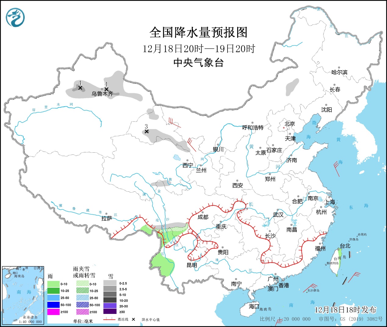 *12月18日20時至19日20時,*新疆沿天山地區、甘肅西部、內蒙古中部、青海南部、川西高原南部等地部分地區有小到中雪或雨夾雪。雲南西部和北部、四川西南部等地部分地區有小雨。甘肅西部、內蒙古西部等地部分地區有4~5級風。台灣海峽、台灣以東洋麪、巴士海峽、南海大部海域有6~8級、陣風9級的大風,其中南海西南部部分海域風力可達9級、陣風10~11級(見圖3)。