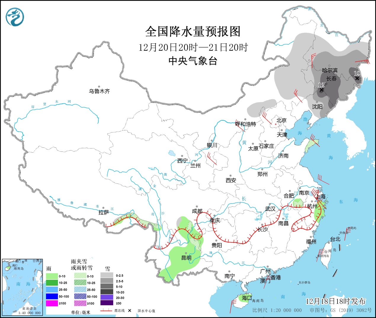 *12月19日20時至20日20時,*內蒙古中東部、遼寧東部和北部、西藏東南部、陝西南部、河南西北部、山東半島等地部分地區有小雪或雨夾雪。四川東部和南部、雲南西部和東北部、重慶北部、陝西南部、湖北西部、湖南西北部、河南北部、安徽西部等地部分地區有小雨。西北地區北部、內蒙古中東部等地部分地區有4~5級風。台灣海峽、台灣以東洋麪、巴士海峽、南海大部海域將有6~7級、陣風8級的東北風(見圖4)。