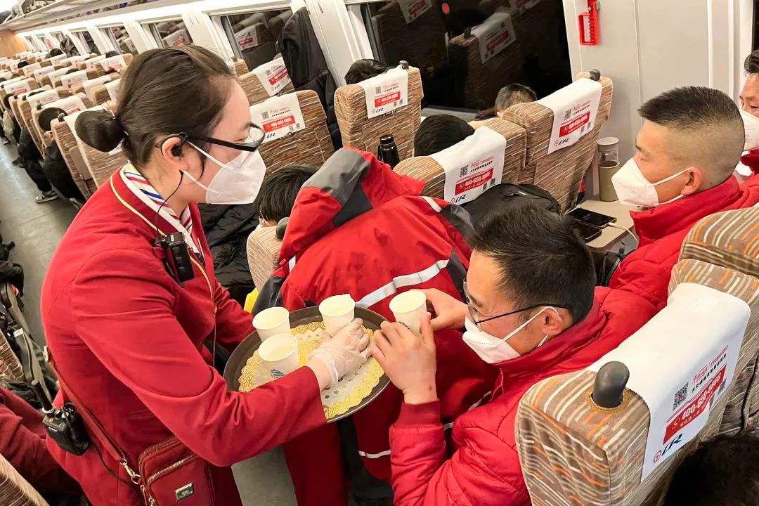 在G58次列車上,列車長鬍怡文聽聞快遞小哥們乘坐本趟列車進京,便安排乘務員第一時間為他們送上熱水。