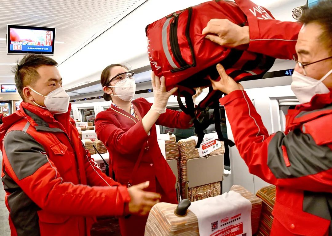 “在這個特殊時期,他們主動支援北京,保障北京市民生活用品、防疫藥品的配送,我們由衷地感謝,希望他們保護好自己。”列車長李偉説,並將提前準備好的KN95口罩和消毒濕巾送到每一名快遞員手中。