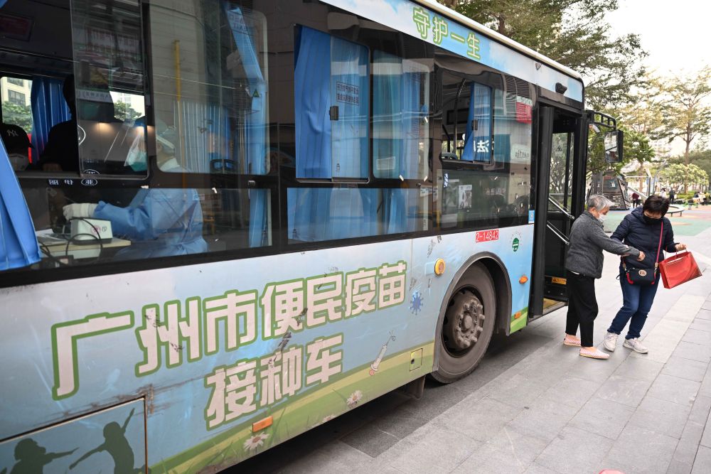 12月12日,在廣州市荔灣區廣鋼新城,老年居民在接種新冠疫苗後走下便民接種車。新華社記者 鄧華 攝