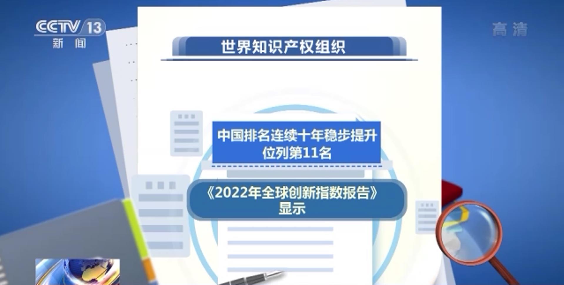 世界知識產權組織發佈的《2022年全球創新指數報告》顯示,中國排名連續十年穩步提升,位列第11名,比2012年提高了23名。