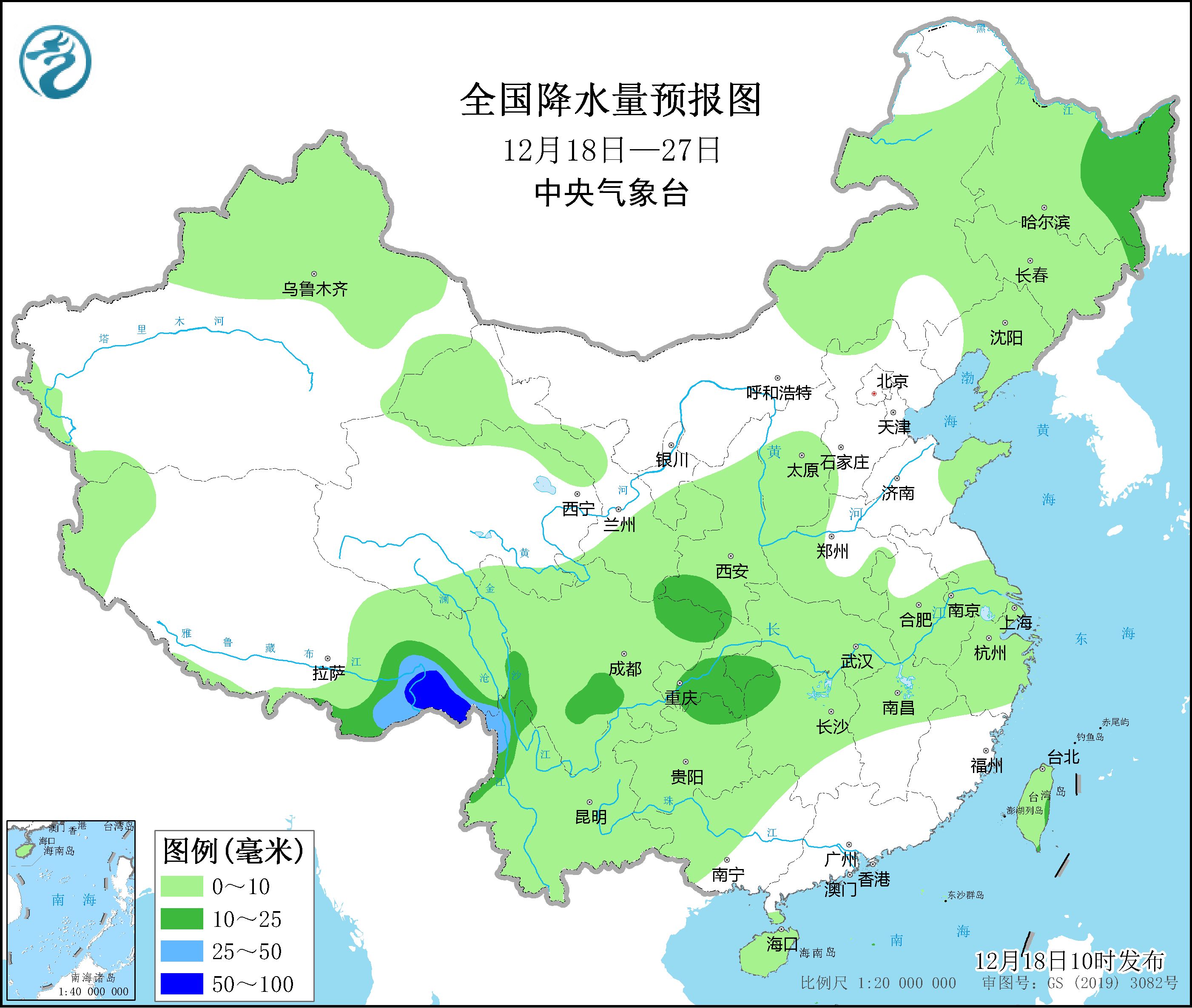 未來10天(12月18-27日),西南地區、東北地區等地累計降水量有5~15毫米,其中西藏東南部局地30~50毫米;上述地區降水較常年同期偏多3-7成;我國中東部其餘大部地區降水較常年同期明顯偏少或無降水。