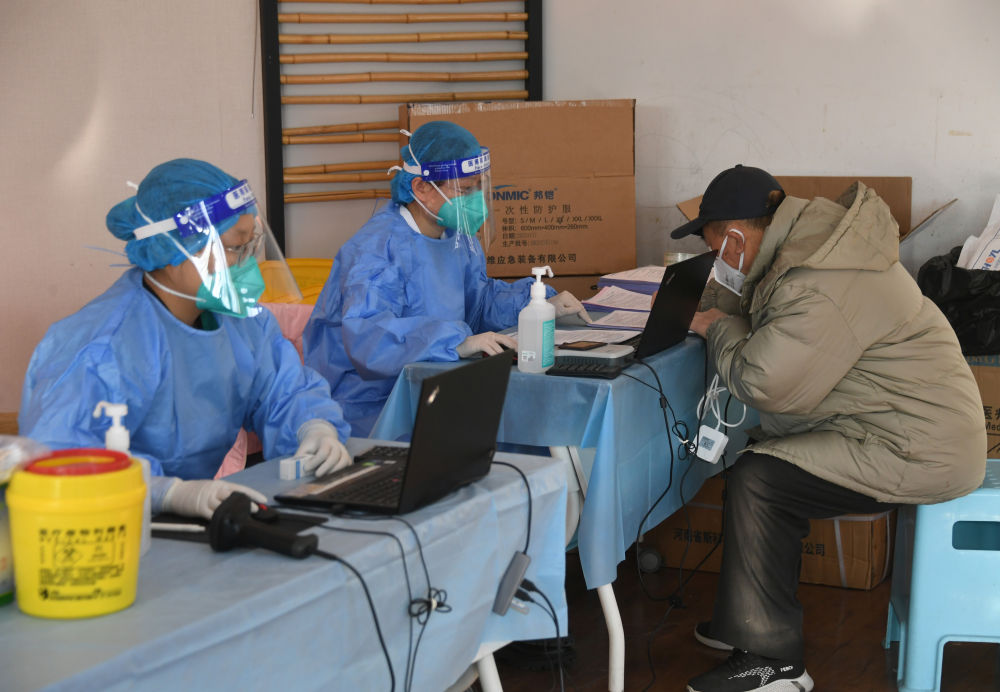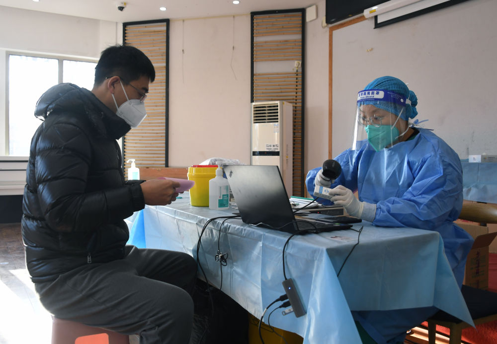 12月17日,在北京市海淀區田村路街道新冠疫苗臨時接種點,醫護人員為市民登記信息。
