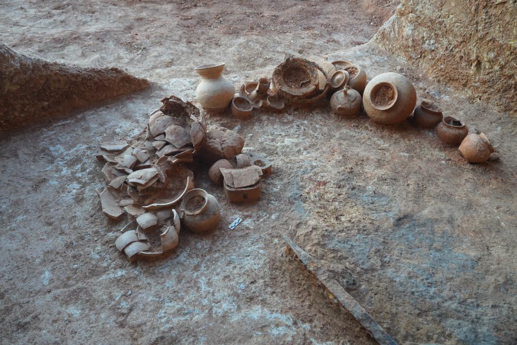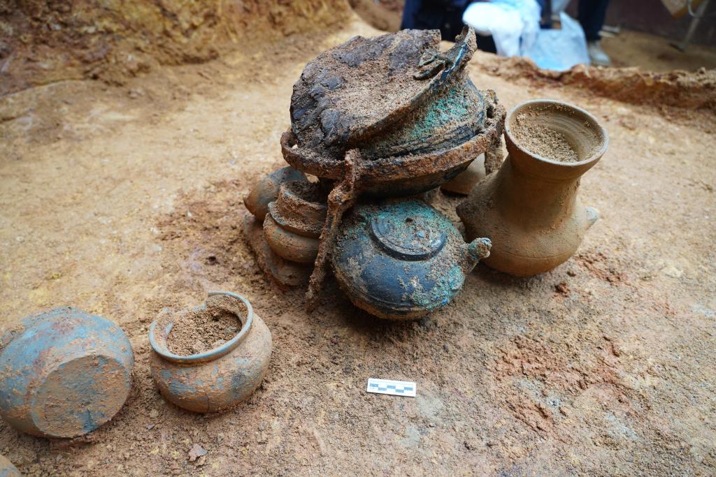 出土遺物中,陶器有罐、釜、壺、鼎、盆、鐎壺以及灶、倉、燈、井、雞塒等模型明器;鐵器有刀、釜和三腳架;銅器有刀、釜、鐎壺、五銖錢等;另有少量石質飾品。陳斌指出,本次發掘的14座墓葬規模較小,隨葬器物級別低,應是普通平民墓。