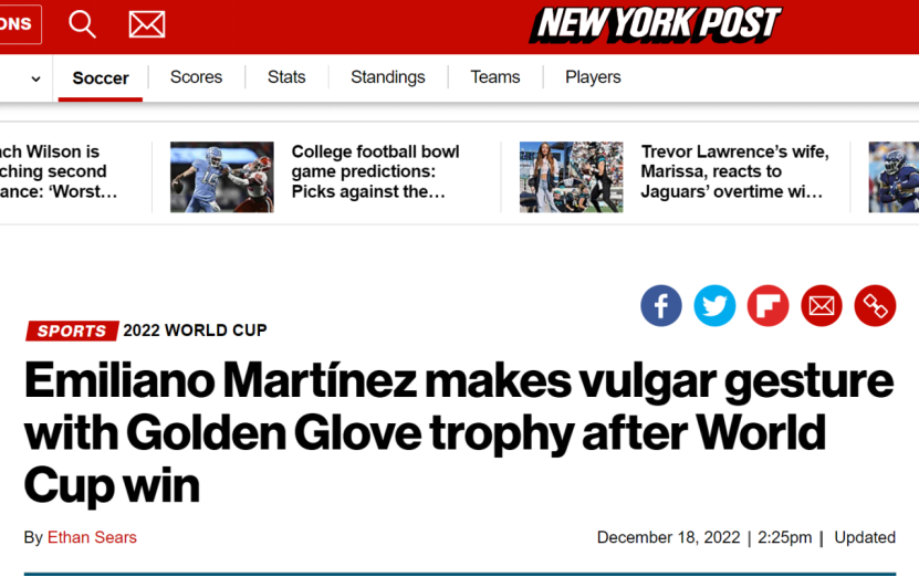 這已不是馬丁內斯第一次做出這樣的舉動。據哥倫比亞“pulzo.com”新聞網站此前報道,2021年7月,馬丁內斯幫助阿根廷奪得美洲盃冠軍,榮膺美洲盃金手套獎,在當時的頒獎台上他也做出了類似的動作,也引發了同樣的爭議。