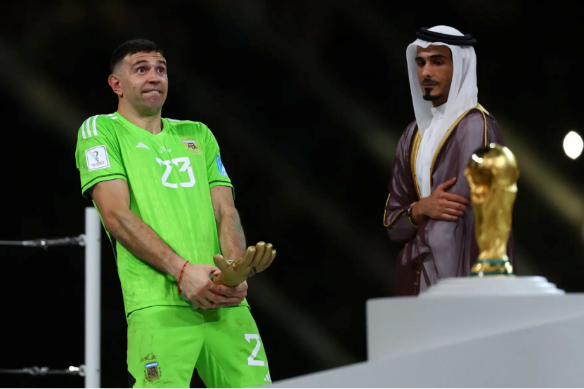 2022世界盃頒獎禮上,馬丁內斯把金手套獎盃放在自己襠部比劃慶祝 圖源:外媒